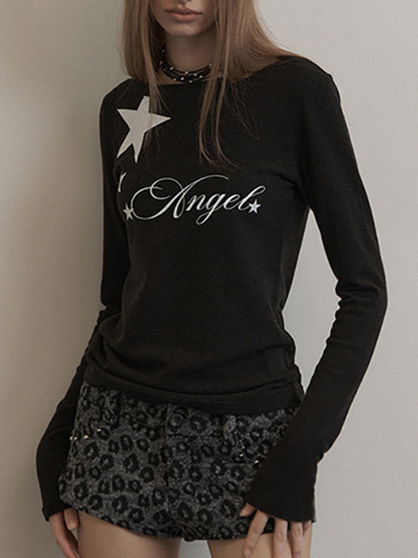 Schulterfreies Oversized Langarm T-Shirt mit Buchstaben Aufdruck