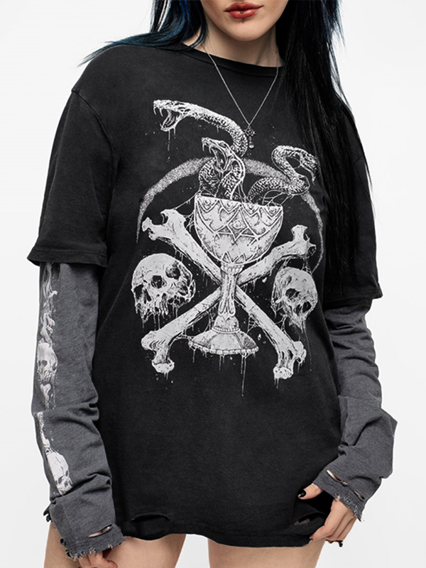 Ausgefranstes Langarm-T-Shirt mit Distressed Snake Skull Print