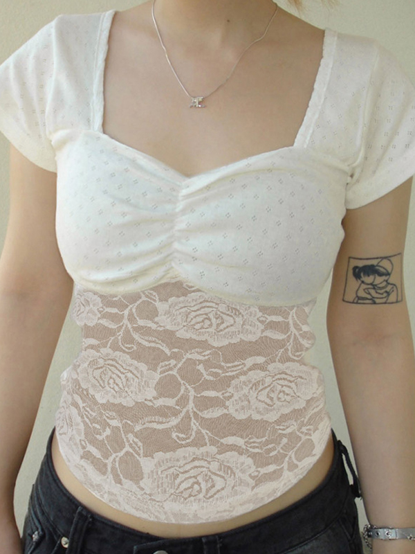 Langärmliges T-Shirt mit Perspektive und Spitzennetz