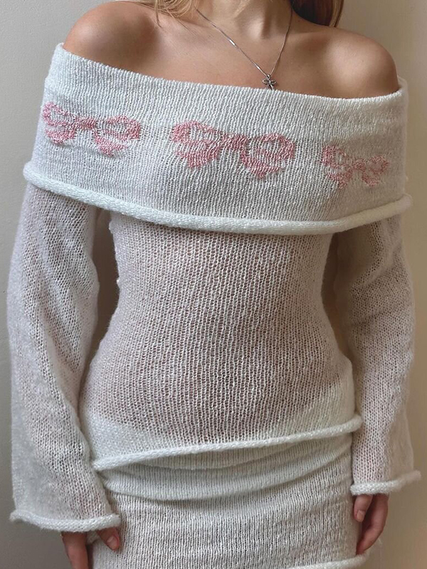 Glockenärmel, eine Schulter, Blumenmuster, lange Ärmel, Strick