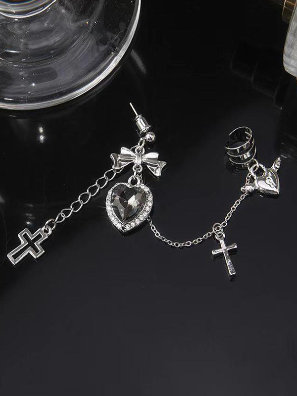 Punk-Ohrring mit Kreuz-Herz-Schleife, Charm-Kette und Manschette