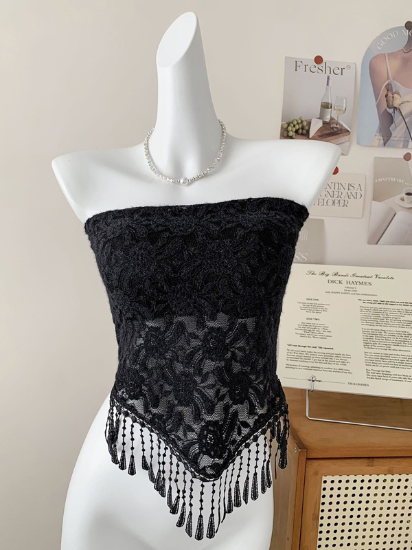 Trägerloses Bandeau-Top aus Spitze mit unregelmäßigen Fransen