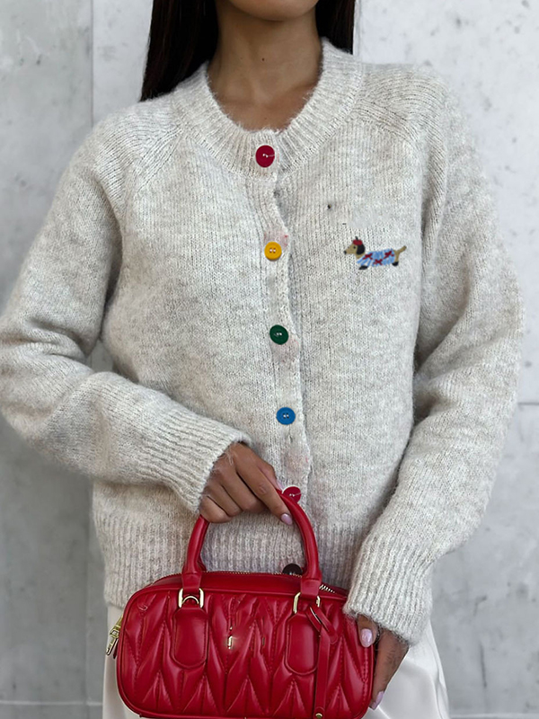 Strickjacke mit Rundhalsausschnitt, bunt, mit Knopf- und Welpenstickerei
