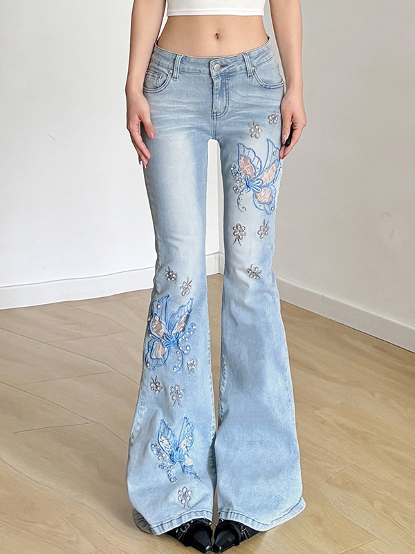 Schlagjeans mit Schmetterlingsstickerei und Perlen