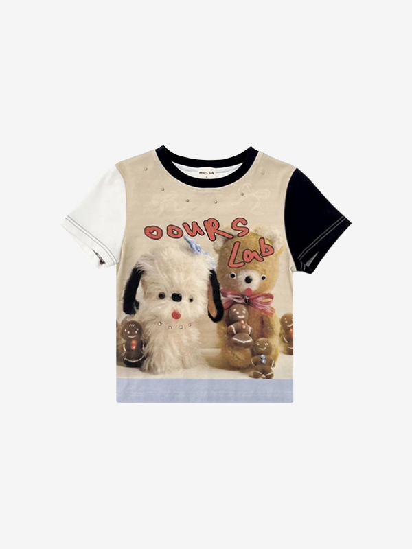 Kurzärmliges T-Shirt mit kontrastierendem Katzen-Print